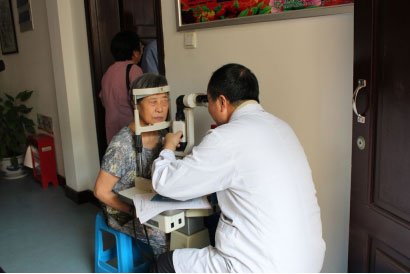 在活动现场,老人们前来咨询白内障、眼睛流泪、看不清楚等问题,医务人员耐心细致的一一解答,医生在裂隙灯下为眼睛有异状的老人做检查,对于需进一步检查的居民,医生建议他们到医院做详细的检查。一位老人拿着我们赠送的阿姆斯勒方格自查表,惊喜的说,“这个在中央电视台上讲过的,是检查眼睛的,但是我一直没找到,没想到你们送给了我们,很好啊!”他很开心的询问使用方法,护士长陈娟向老人详细介绍了使用的步奏、如何在家自查等等。短短一个小时,医疗队为到社区参加重阳节活动的老人们筛查了眼睛,并为每位老人都赠送了眼保健宣传手册。